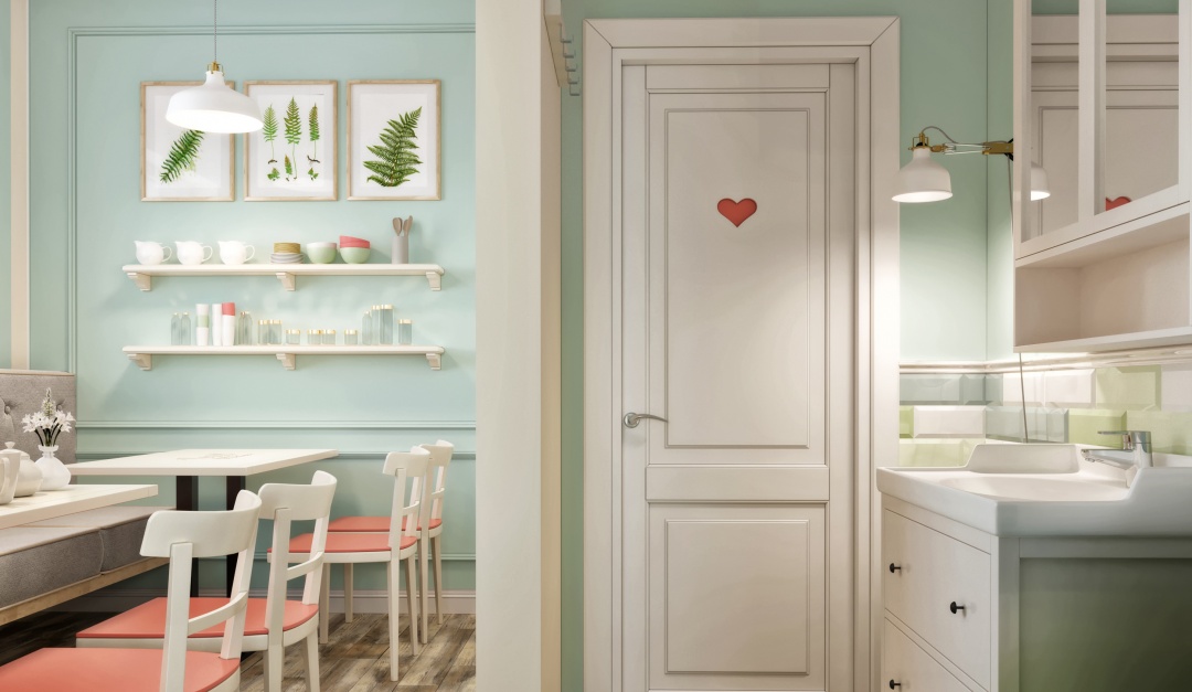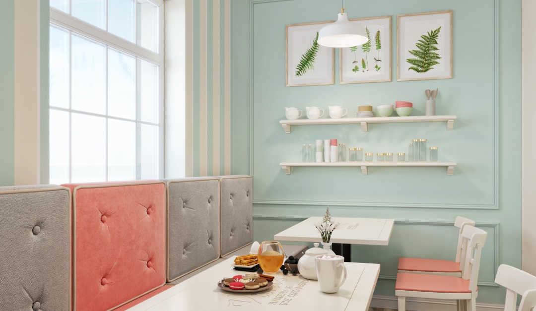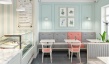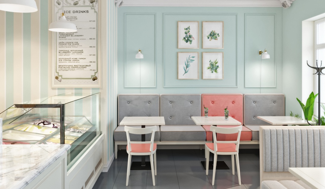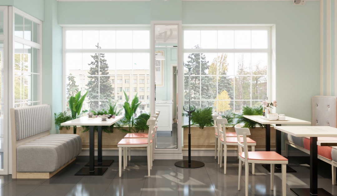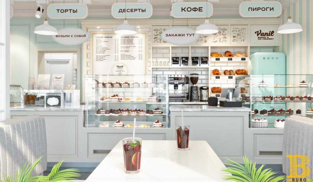 Vanil. Дизайн заведения, выполнен в фирменных, мятных тонах. Лаконичные