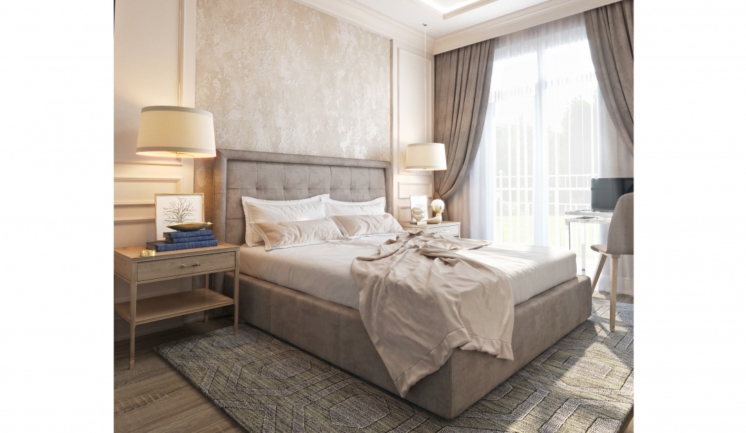 Все решено в кремовых тонах с различными вариациями оттенков. В целом интерьер получился монохромным, лишь в некоторых местах мы добавили контраста за счет мебели.