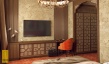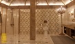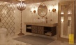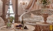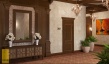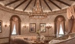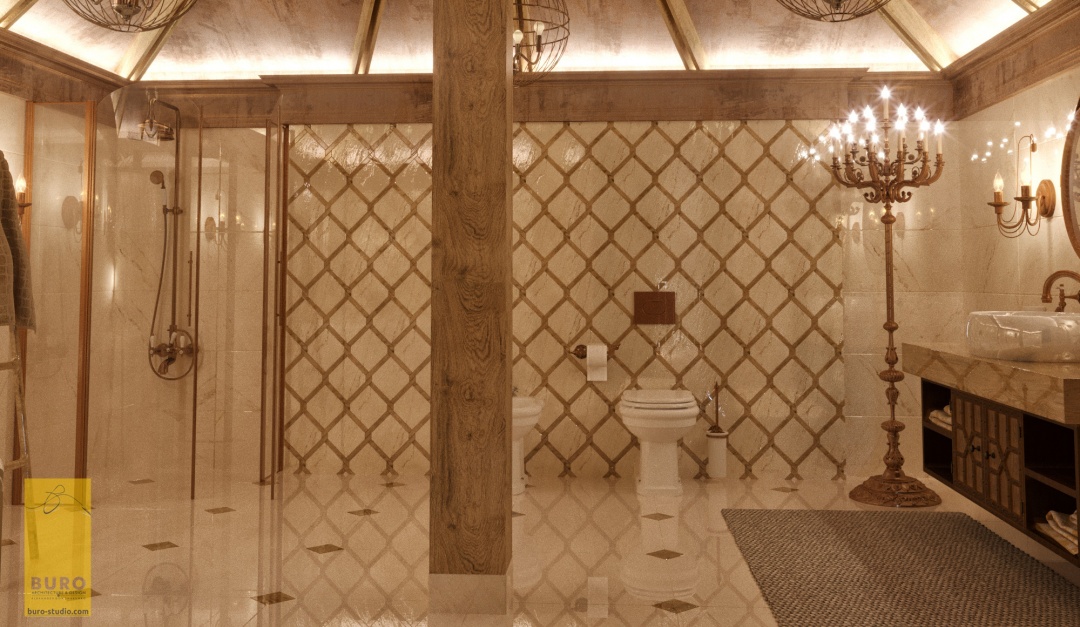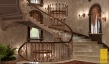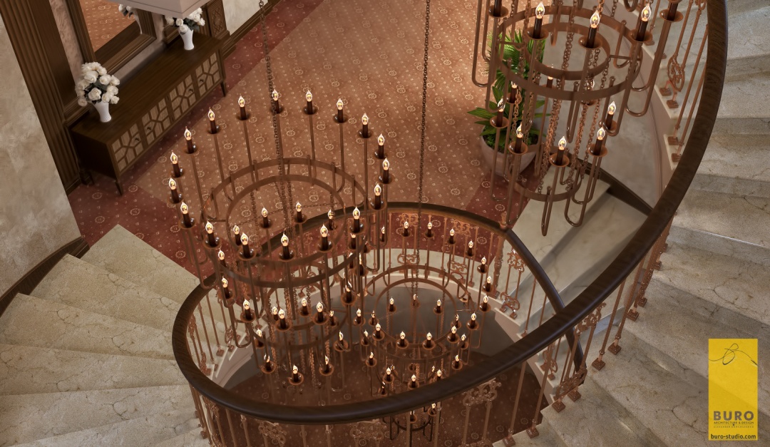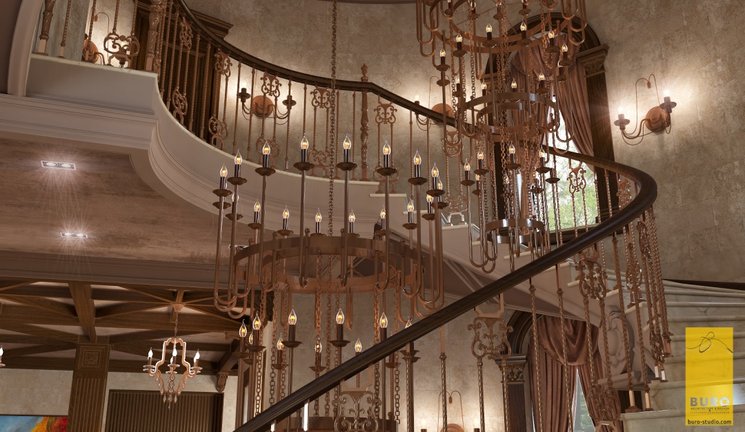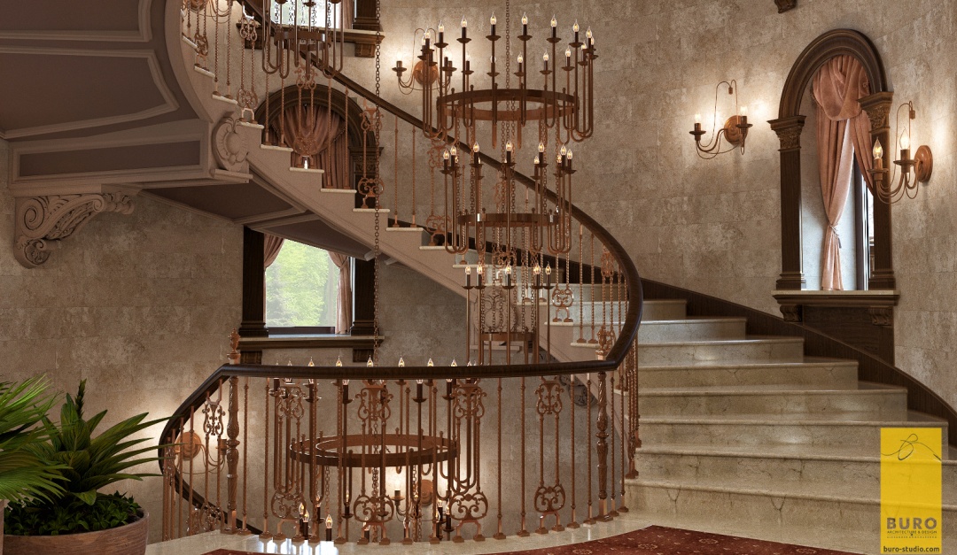 Для такого интерьера свойственно обилие природного и искусственного камня, массивных и сложных люстр, изготовленных из материалов, имитирующих драгоценные камни. Здесь присутствуют арки, роскошная мебель, орнаментальные ткани. Для освещения использовались бра в виде кованых свечей. Один из центральных элементов – спиралевидная лестница, которая встречает гостей при в ходе в холл.