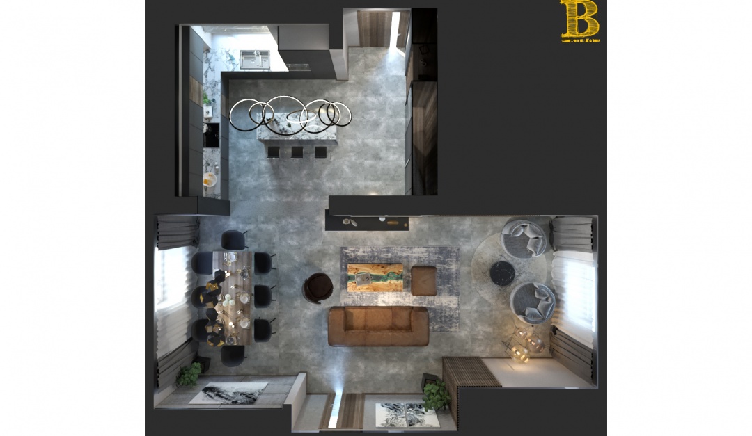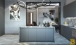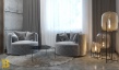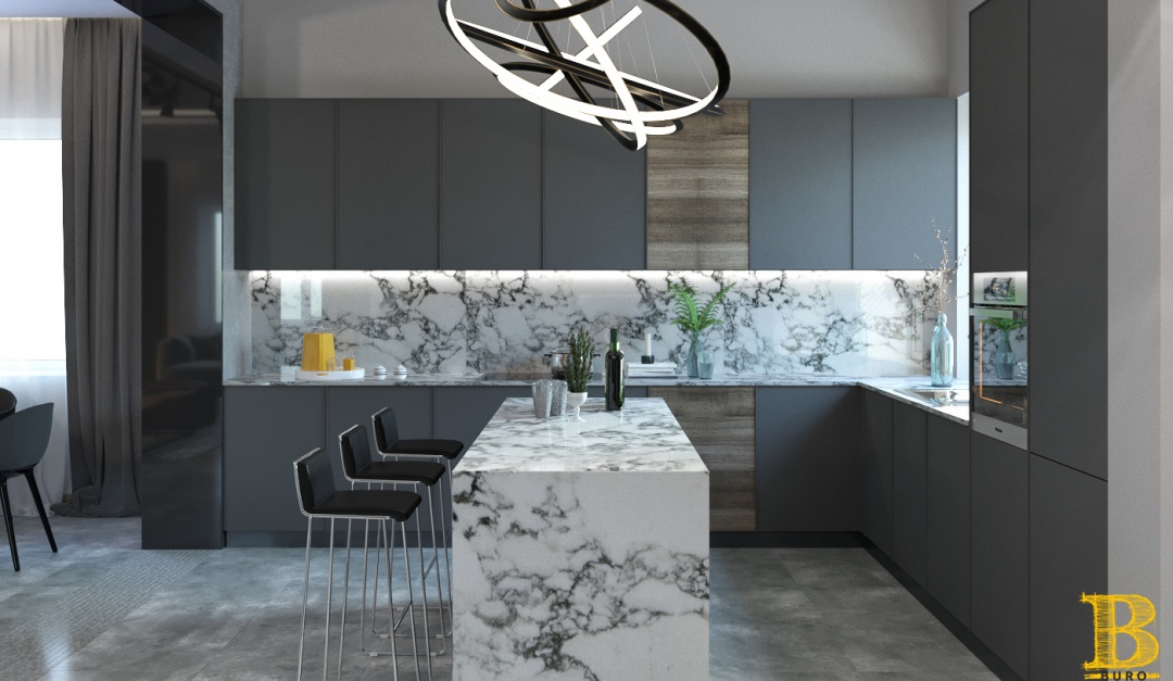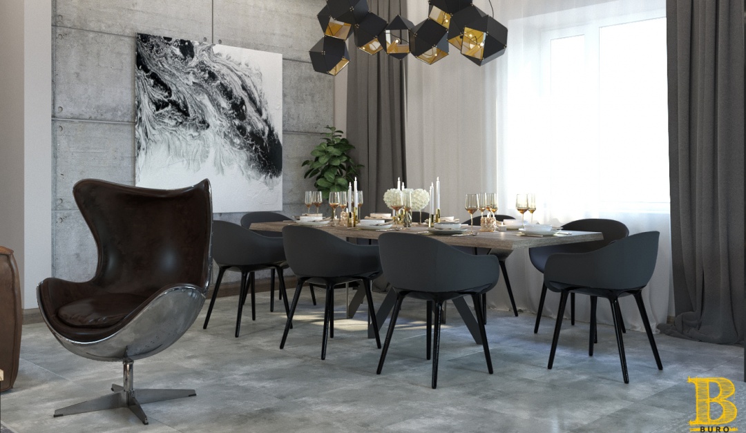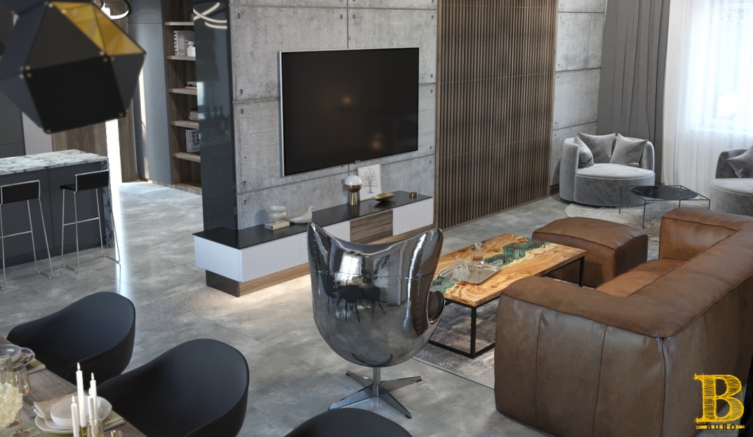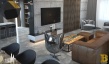 Интерьер этой квартиры выполнен в холодных оттенках, здесь превалируют разнообразные оттенки серого, небольшие вкрапления белого, черного и коричневого.