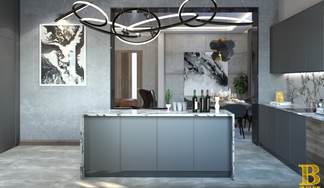 В отделке использованы натуральные материалы, в мебели различные текстуры – кожа, бархат. Особо внимание мы уделили освещению – необычная люстра на кухне, в зоне столовой и гостиной. Сдержанность интерьера подчеркивается небольшим количеством декоров и качественными материалами.