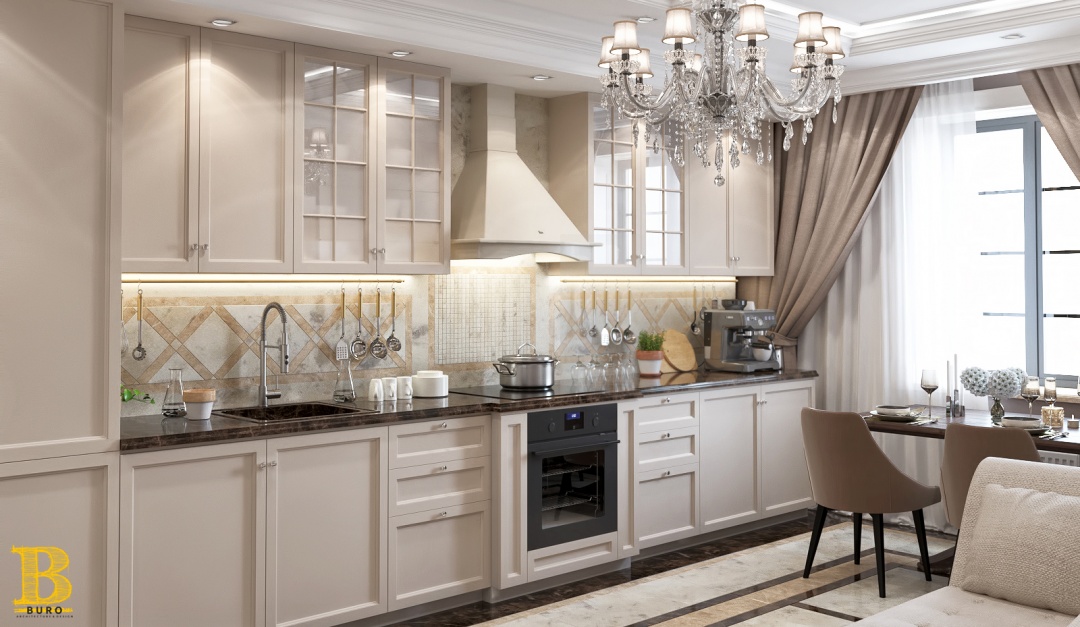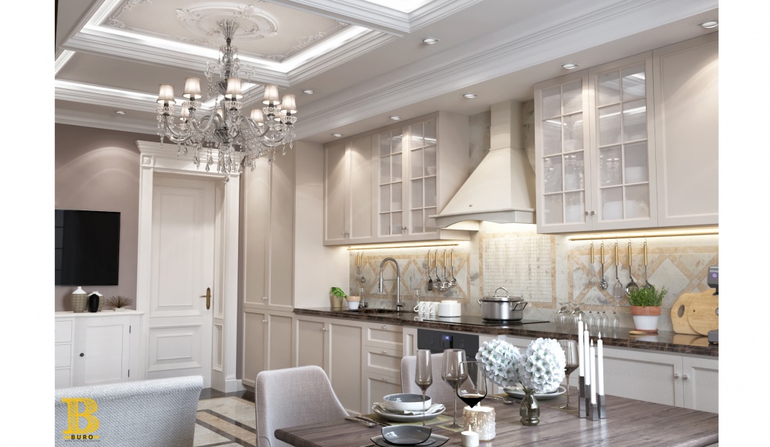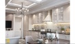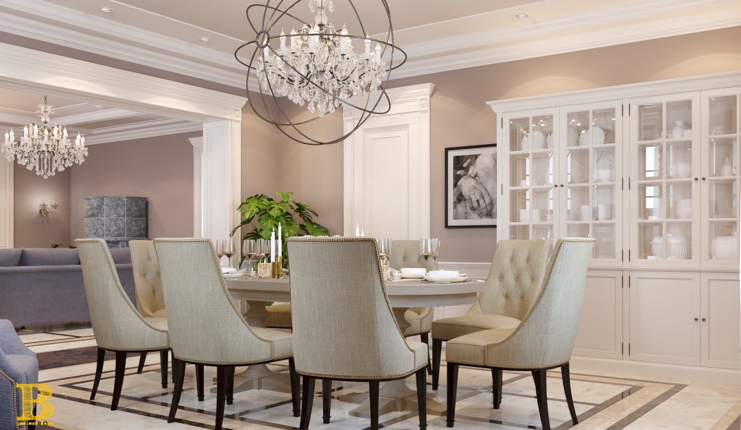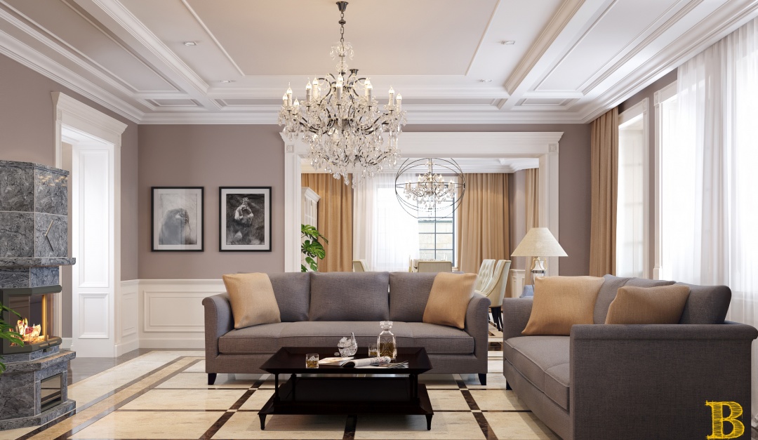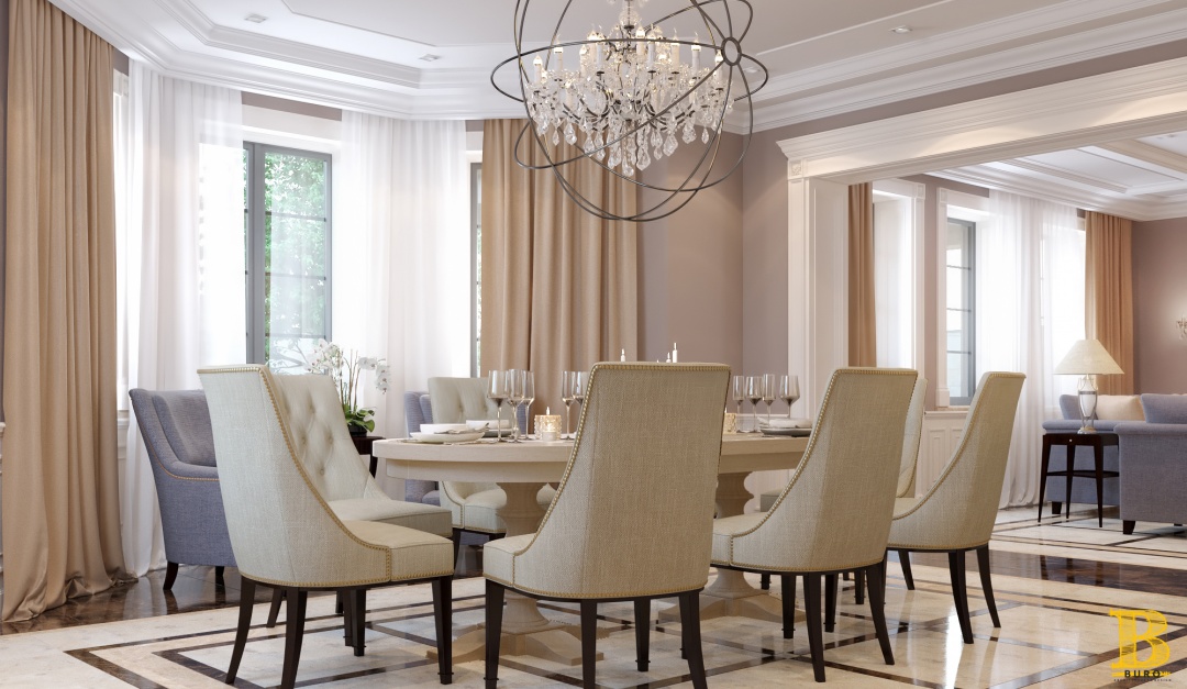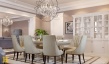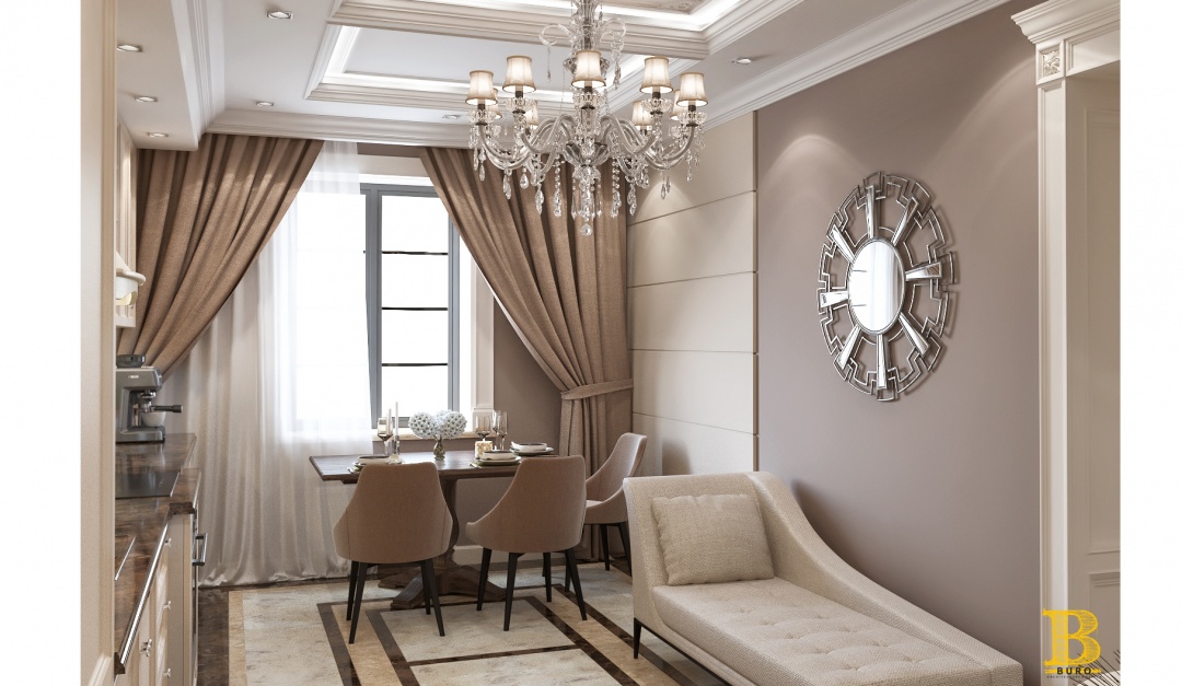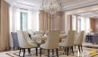 Традиционный классический стиль сочетается с современными решениями: мебель и светильники необычной формы, дорогие ткани, картины, множество декоров и благородные оттенки.