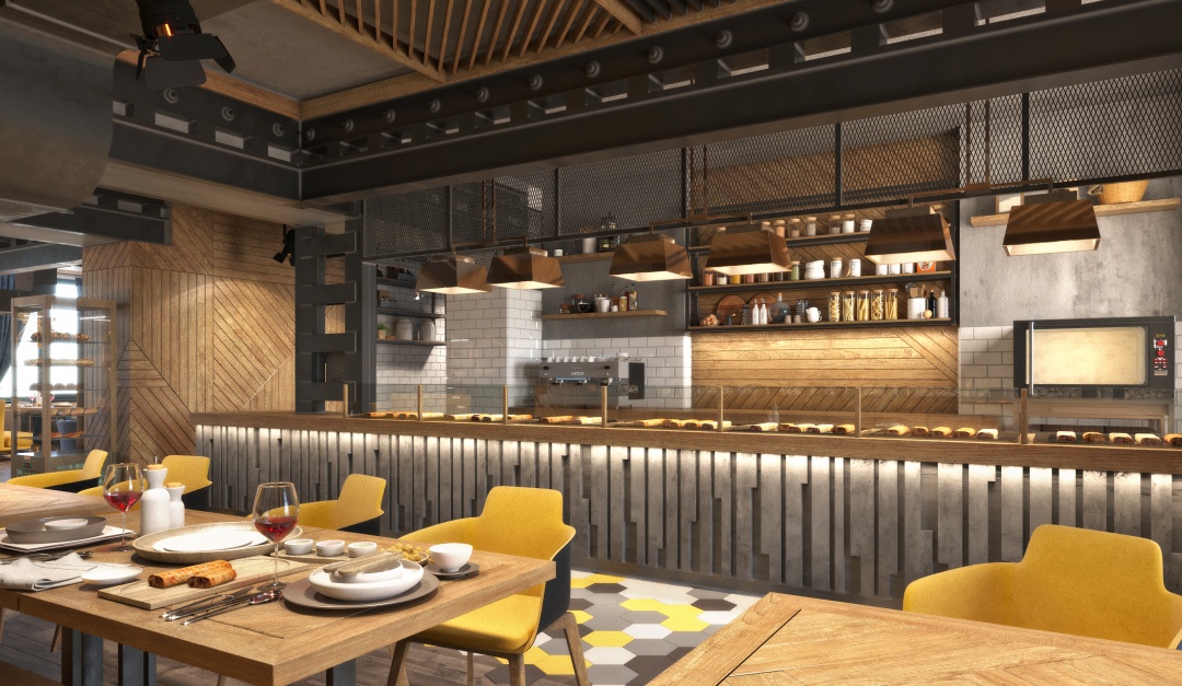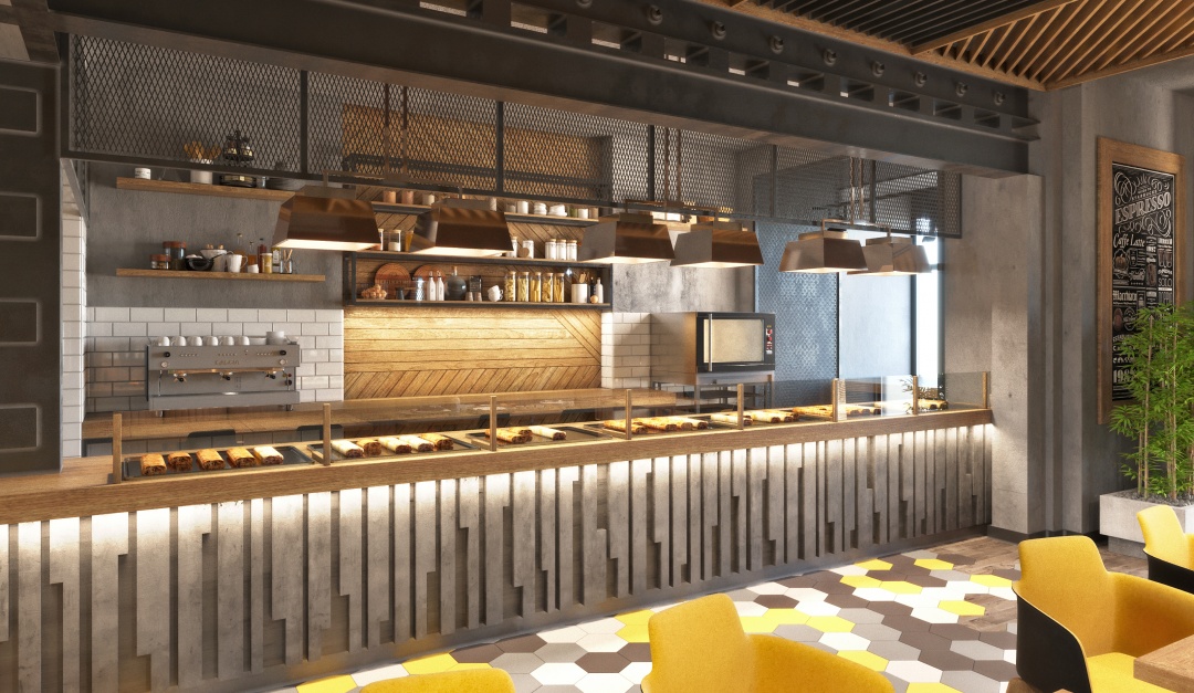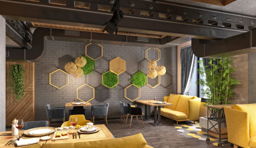 За основу взят серый цвет, к нему мы добавили много элементов из натуральной древесины – двери, отделка, декоры, яркую желтую мягкую мебель и много живых растений. Здесь можно спастись от ежедневной суеты и расслабиться, наслаждаясь вкусным кофе и штруделем.
